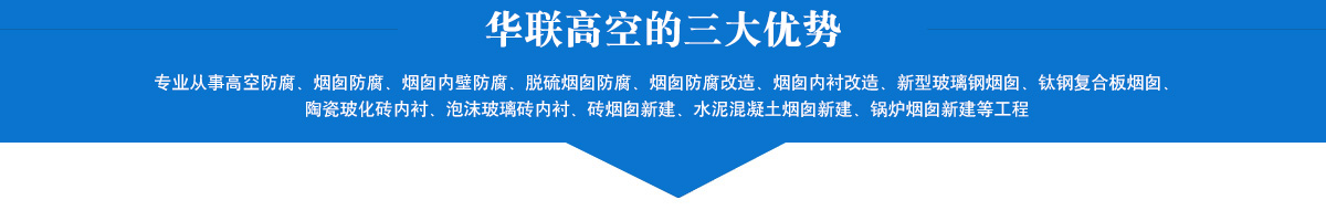 主要承接高空防腐、煙囪防腐、煙囪內壁防腐、脫硫煙囪防腐、煙囪防腐改造、煙囪內襯改造、新型玻璃鋼煙囪、鈦鋼復合板煙囪、陶瓷玻化磚內襯、泡沫玻璃磚內襯、磚煙囪新建、水泥混凝土煙囪新建、鍋爐煙囪新建、鈦鋼煙囪新建制作安裝等各項業務